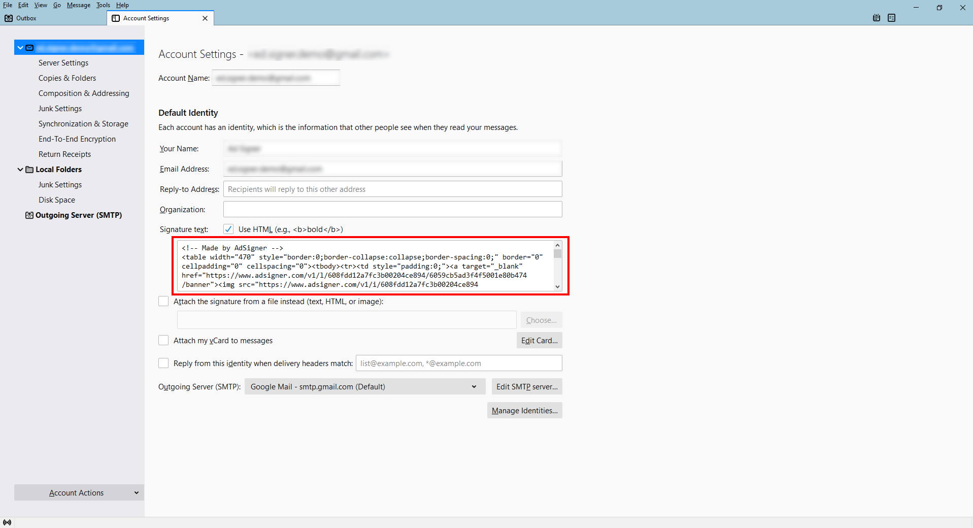 Return to your Thunderbird app > Open Signature text section > Paste your signature’s HTML code in the blank box > Exit settings.